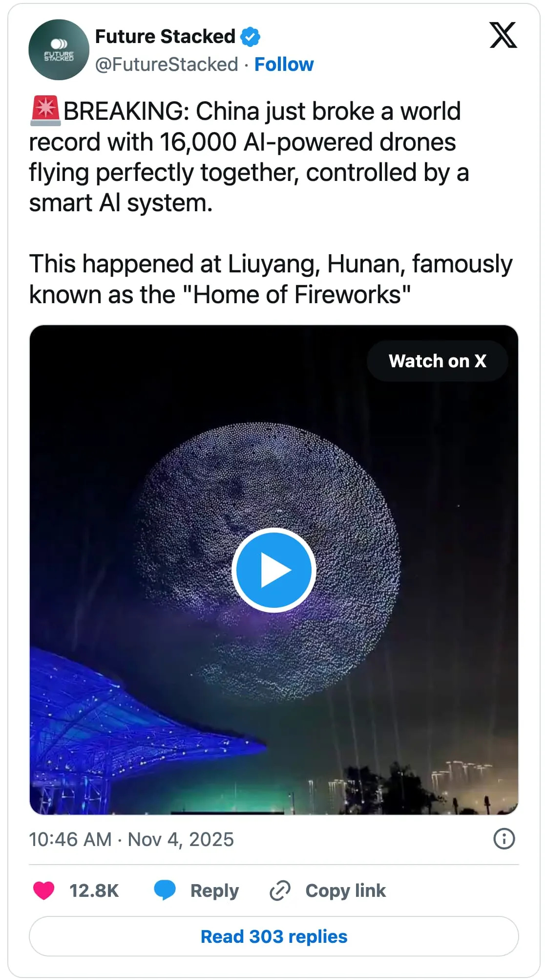 Sky full of smart drones: In Liuyang, Hunan — China’s “Home of Fireworks” — a swarm of 16,000 AI-controlled drones just broke the world record for largest coordinated drone show, painting massive neon patterns in the sky and quietly previewing a future where fireworks, light shows, and maybe even battlefield formations are choreographed by algorithms instead of pyrotechnicians.